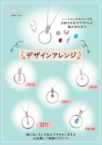 『ハートリンク』は、弊社のオリジナル商品で、〝お手持ちのリングをペンダントとして使える”ようにできるパーツです。 ご自身でハートリンクを取り付けていただくだけでペンダントヘッドになるので、リングそのものは加工せずにお首元で使って頂けます! 『手元に着けるのは苦手だけれど、結婚指輪や形見の指輪を身に着けたい』 『仕事上指輪を着けられない』 という方にピッタリの商品です☆ また、ハートリンクにお好きなお石やを着けてオリジナリティを出して楽しんで頂くのもお勧めです♪ 店頭にてサンプルをご用意しておりますので、是非お手に取ってご覧ください!