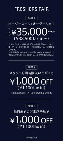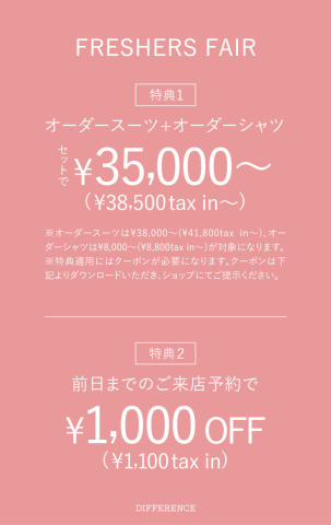ーなぜ、最初のスーツを「オーダー」すべきなのか。 入社式や卒業式は、人生における 「信頼感」と「品格」が試される最初の機会です。 プロの仕立てによるジャストフィットこそが、 あなた自身の魅力を最大限に引き出し、 好印象と信頼感を勝ち取る近道となります。 「オーダースーツはまだ早い」とお考えかもしれません。 しかし、体型が変化しやすいこの時期だからこそ、 細部にまで調整できるオーダーは最適です。 +-+-+-+-+-+ SPECIAL OFFER +-+-+-+-+-+ 【期間限定】FRESHERS FAIR +-+-+-+-+-+-+-+-+-+-+-+-+-+-+-+-+-+-+-+ ▪️開催期間 : 2026/2/27(金)まで ▪️特典: オーダースーツとオーダーシャツがセットで、 ¥35,000〜(¥38,500tax in〜) ※オーダースーツは¥38,000~(¥41,800tax in~)、 オーダーシャツは¥8,000〜(¥8,800tax in〜)が 対象になります。 ■ご予約で、さらに特別な体験を ご来店のご予約いただくことで、 お客様のご来店に合わせてテイラーと スーツ生地選びやオプションについてなど、 じっくりとご相談いただけます。 待ち時間なく、より質の高いパーソナルなサービスをご提供いたします。 今回のSPECIAL SALEを、 最高の形でお楽しみいただくために、 ぜひご予約をご活用ください。 ■RESERVATION OFFER 前日までにご来店予約いただくと ¥1,000 OFF (¥1,100tax in) ■備考 ※FRESHERS FAIRにおける現在の納期は、 スーツ(海外縫製生地)5週間前後、 シャツ3週間前後となります。 なお、スーツは納期短縮サービス(有料)対象外となります。 ※25歳以下の方限定になります。 (身分証などをご提示いただく場合がございます) ※ベスト(スリーピース)や有料オプション (ダブルブレスト等)は別途料金を頂戴いたします。 ※他のクーポン、キャンペーン、割引きとの併用はできません。(併用可と記載があるものは除く) ※企業・団体のご優待割引および株主ご優待割引との併用はできません。