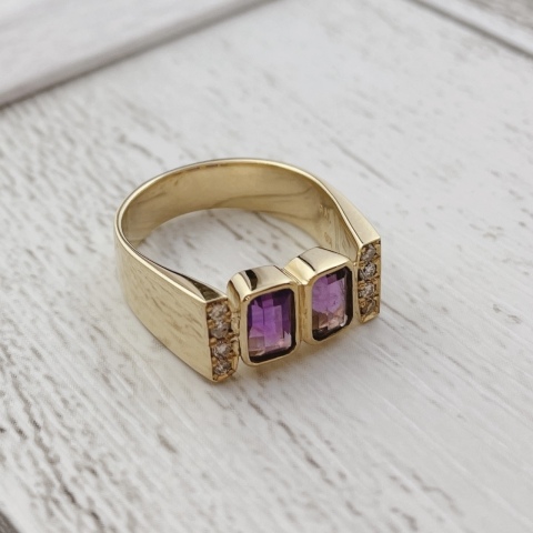 お持ち込みのアメシスト2石とメレダイヤでリングをお仕立てさせていただきました! しっかりとボリュームを持たせたアームで、着け心地も抜群です☆ サイドのメレも含め全てお客様のお石をセッティングしております。 お客様が特にお好きだという四角いカットの宝石を、これからはリングとしてお手元で楽しんで頂ければと思います♪ 皆様も、こだわりを詰め込んだオリジナルジュエリーをお仕立てしてみませんか? ご相談お待ちしております!!