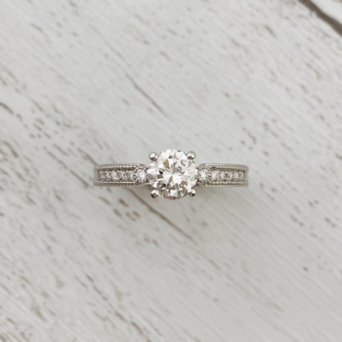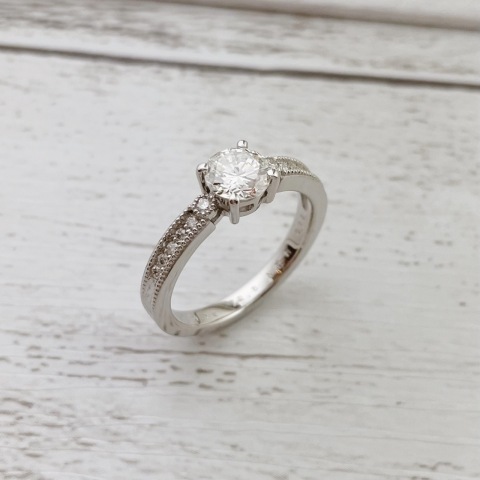 『立爪』のリングはその高さと大きくとがった爪が気になるとご相談が多いです。 高品質なお石が使われていることがほとんどですし、何より思い出のお品物であることも多いですから、できればたくさん身に着けていきたい・・・! こちらの婚約指輪もそういったご相談で、普段使いできるようなリングにリモデルさせていただきました! 高さを抑え、アームはミル打ち加工を施した優しい印象のデザインです☆ 上質のメレダイヤをご用意し、メインのお石に輝きを添えております。 これまでの分も、これからたくさん身に着けて楽しんで頂けましたら幸いです! 大切なジュエリーを仕舞いこんでしまっている方は、是非ご相談ください!
