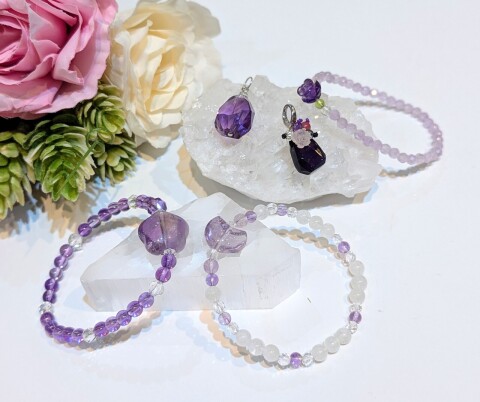 今月は2月の誕生石「アメジスト」をご紹介します。アメジストは、不安や怒り迷いを退け、心の安らぎをもたらすといわれています。 また、今回はアメジストを加熱処理して作られた、スコロライトもご紹介します。乳白色のラベンダー色と神秘的な輝きを持つ石です。 アメジスト天眼石も数量限定でご紹介します。 美しいアメジストの世界をぜひご覧ください。