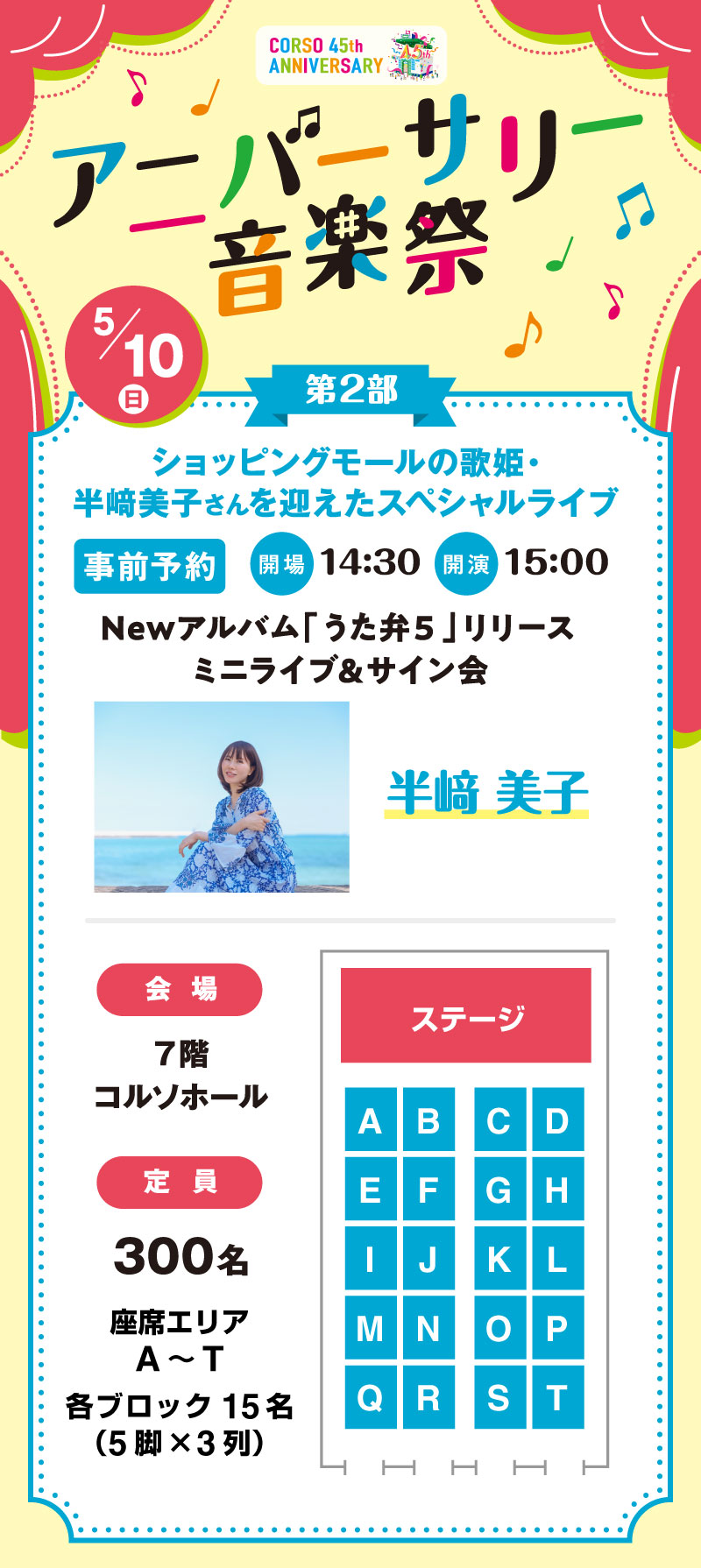 | 定員 | 300名様 座席エリア A~T 各ブロック15名(5脚×3列) ※定員に達し次第終了 |